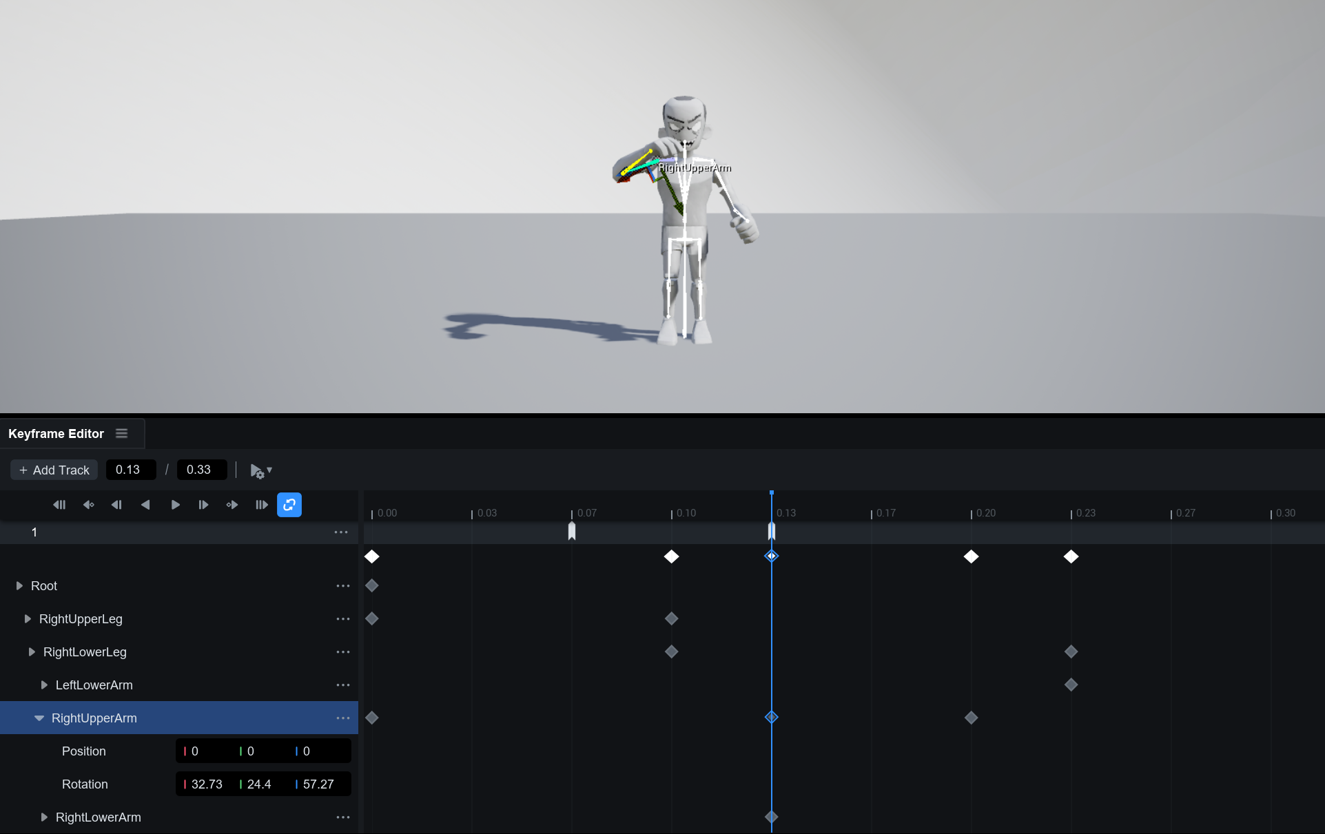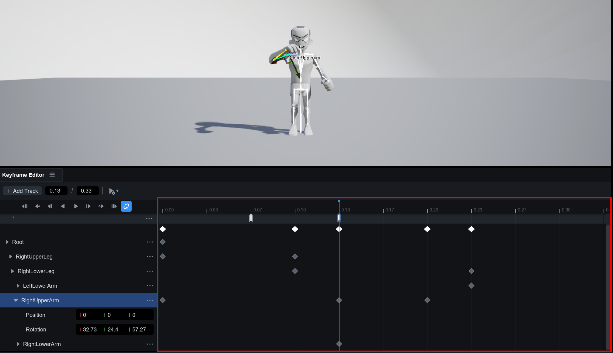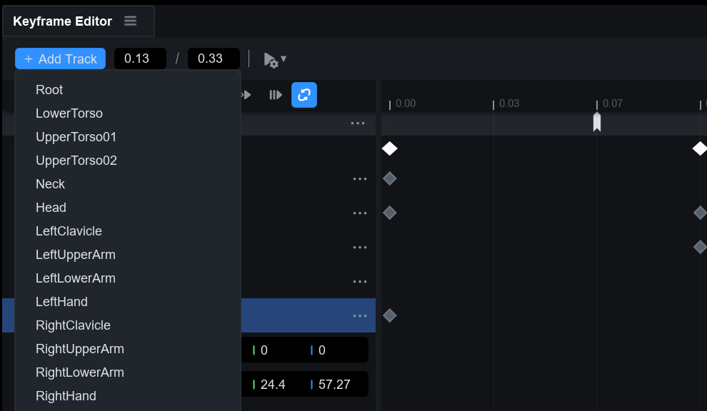 타임라인에서 각 본에 대한 **트랙**을 추가하거나 제거하고, 각 본의 위치와 회전 정보를 키프레임 단위로 정밀하게 편집할 수 있습니다.