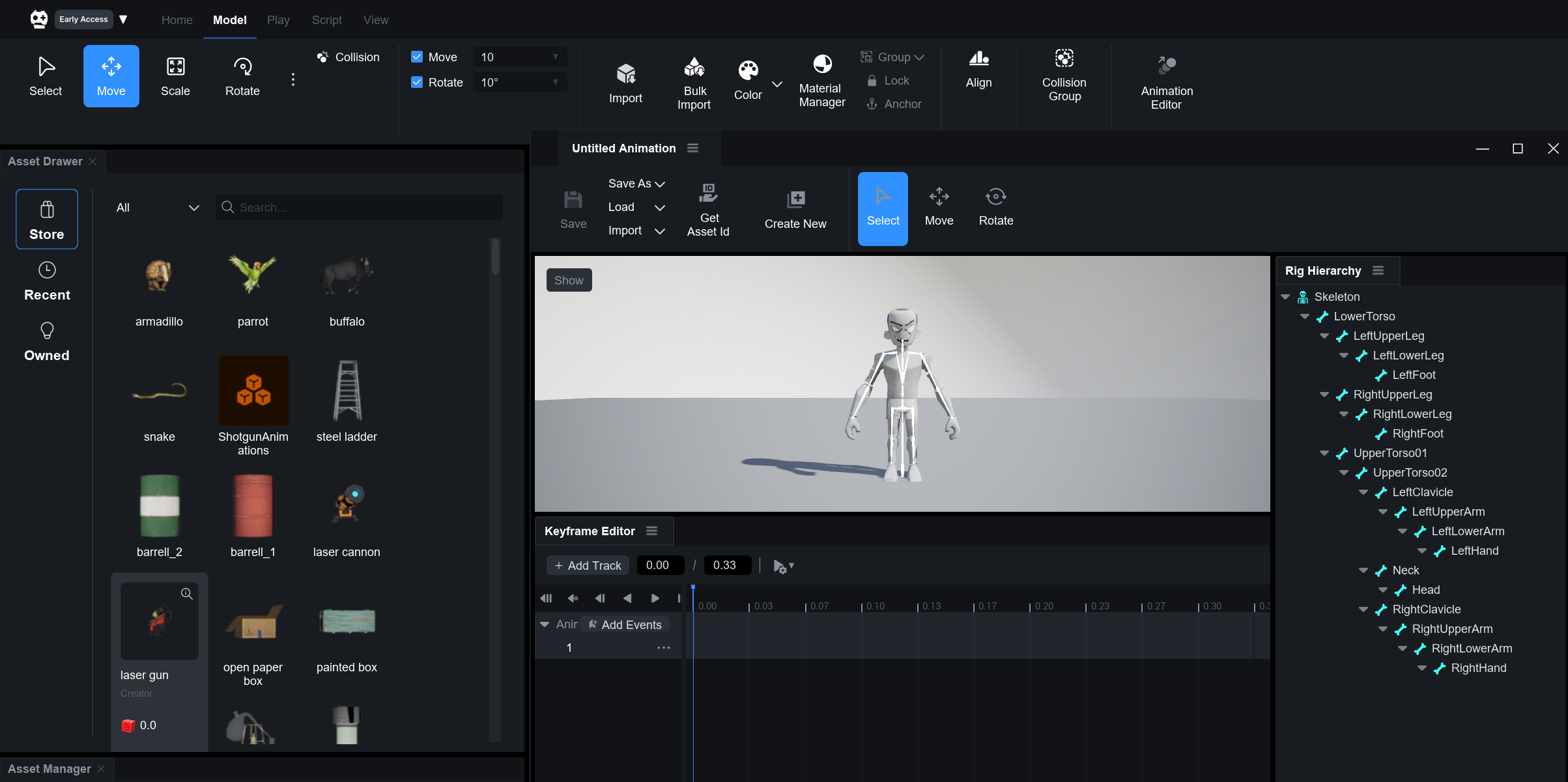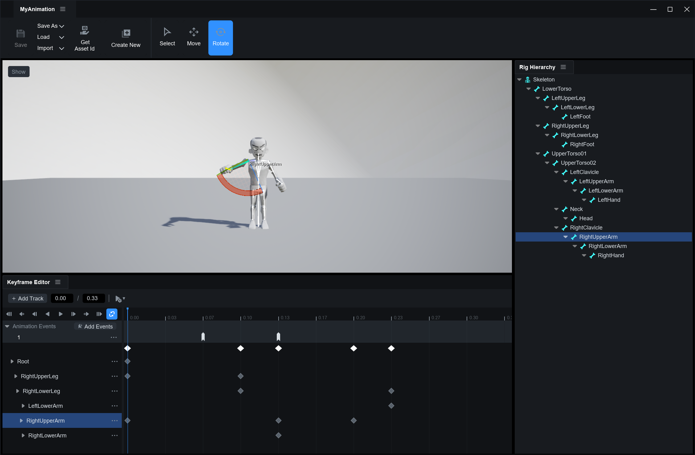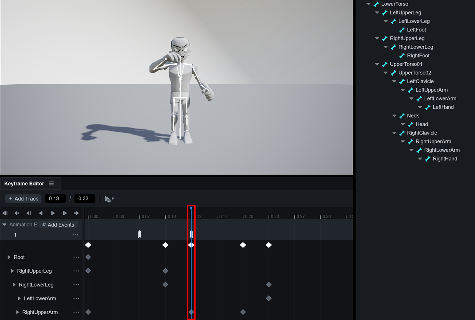 타임라인에서 각 본에 대한 **트랙**을 추가하거나 제거하고, 각 본의 위치와 회전 정보를 키프레임 단위로 정밀하게 편집할 수 있습니다.