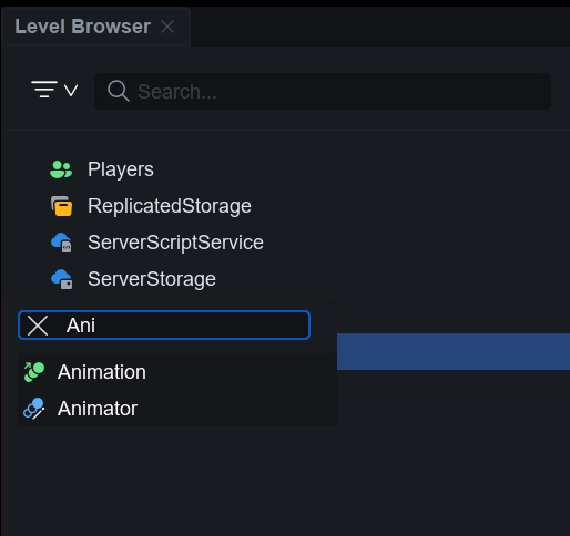 애니메이션을 사용하려면 Level Browser에 **반드시 배치**되어 있어야 합니다. ServerStorage에 **Animation**을 추가합니다.