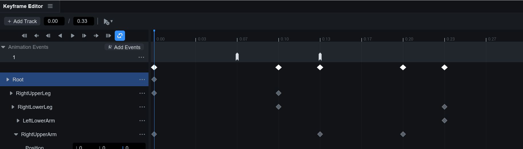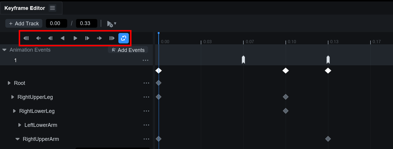 * 등록한 이벤트는 타임라인의 **애니메이션 이벤트 바(Event Bar)** 상에 마커 형태로 표시됩니다.