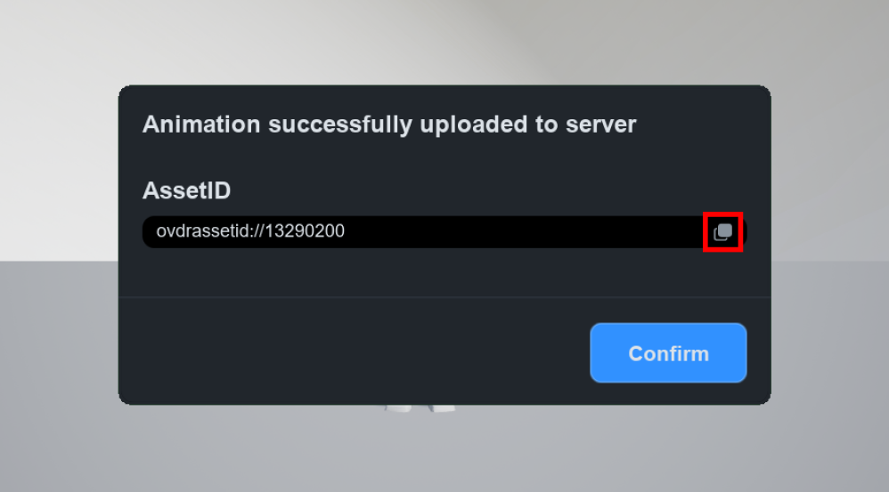 서버에 애니메이션 등록이 완료되면 **Asset Id**가 생성됩니다. 이미지에서 표시한 버튼을 눌러 **Asset Id를 복사**하세요.
