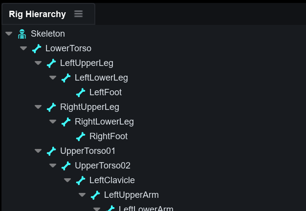 Rig Hierarchy 패널에 아바타의 골격 구조가 표시됩니다. Rig Hierarchy에서 본을 클릭하면 미리보기 패널에서도 해당 본이 선택됩니다.