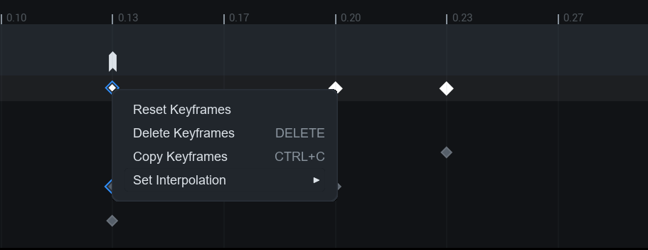 타임라인에서 **키프레임을 우클릭**하면 표시되는 메뉴에서 애니메이션 정보를 초기화하거나 삭제할 수 있고, **인터폴레이션(Interpolation)**&#xC744; 통해 보간 방식을 선형(Linear), 고정(Constant), 큐빅(Cubic)으로 설정할 수 있습니다.