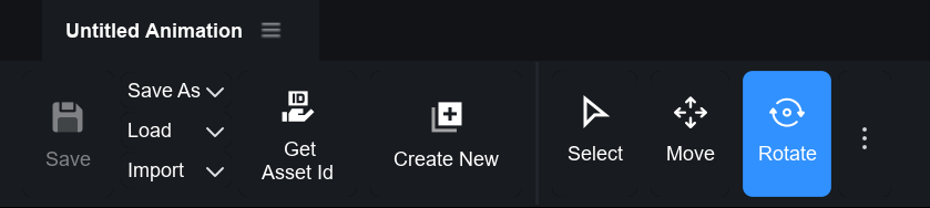 <table><thead><tr><th width="221.017578125">기능</th><th>설명</th></tr></thead><tbody><tr><td><strong>Save</strong></td><td>작업중인 애니메이션을 저장합니다.<br>(맵이 아닌 현재 PC의 스튜디오에 내부적으로 저장됩니다.)</td></tr><tr><td><strong>Save As</strong></td><td>작업중인 애니메이션을 다른 이름으로 저장합니다.</td></tr><tr><td><strong>Load</strong></td><td>저장한 작업 애니메이션을 불러옵니다.</td></tr><tr><td><strong>Import</strong></td><td><ul><li><strong>Import from OVERDARE :</strong> 서버에 등록된 내 애니메이션을 불러옵니다.</li><li><strong>Import from FBX :</strong> fbx 파일로 애니메이션을 가져옵니다.</li></ul></td></tr><tr><td><strong>Get Asset Id</strong></td><td>작업중인 애니메이션을 <strong>서버에 등록</strong>하고 Asset Id를 생성합니다.</td></tr><tr><td><strong>Create New</strong></td><td>새로운 애니메이션을 만듭니다.</td></tr><tr><td><strong>Select</strong></td><td>미리보기 패널의 편집 모드를 <strong>선택 모드</strong>로 변경합니다.</td></tr><tr><td><strong>Move</strong></td><td>미리보기 패널의 편집 모드를 <strong>이동 모드</strong>로 변경합니다.<br>(미리보기 패널에서 본을 클릭하여, 본을 이동시킬 수 있습니다.)</td></tr><tr><td><strong>Rotate</strong></td><td>미리보기 패널의 편집 모드를 <strong>회전 모드</strong>로 변경합니다.<br>(미리보기 패널에서 본을 클릭하여, 본을 회전시킬 수 있습니다.)</td></tr></tbody></table>