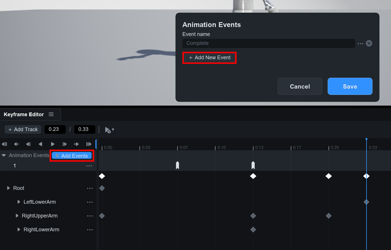 **Add Events 버튼**을 눌러 애니메이션 이벤트를 추가하면, 애니메이션의 특정 프레임에서 **스크립트와 상호작용**할 수 있습니다.