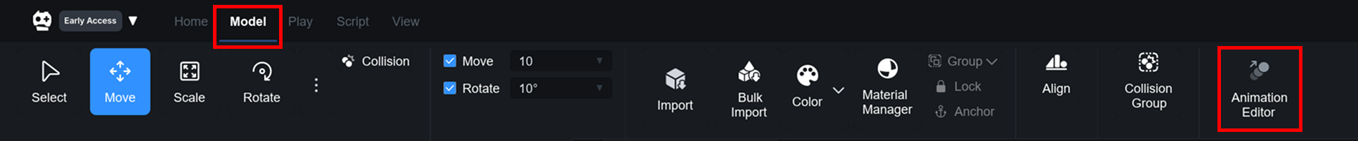 애니메이션 에디터는 OVERDARE Studio 최상단 탭 영역에서 **Model탭**을 선택하면 출력되는 **Animation Editor 버튼**을 클릭해서 표시할 수 있습니다.