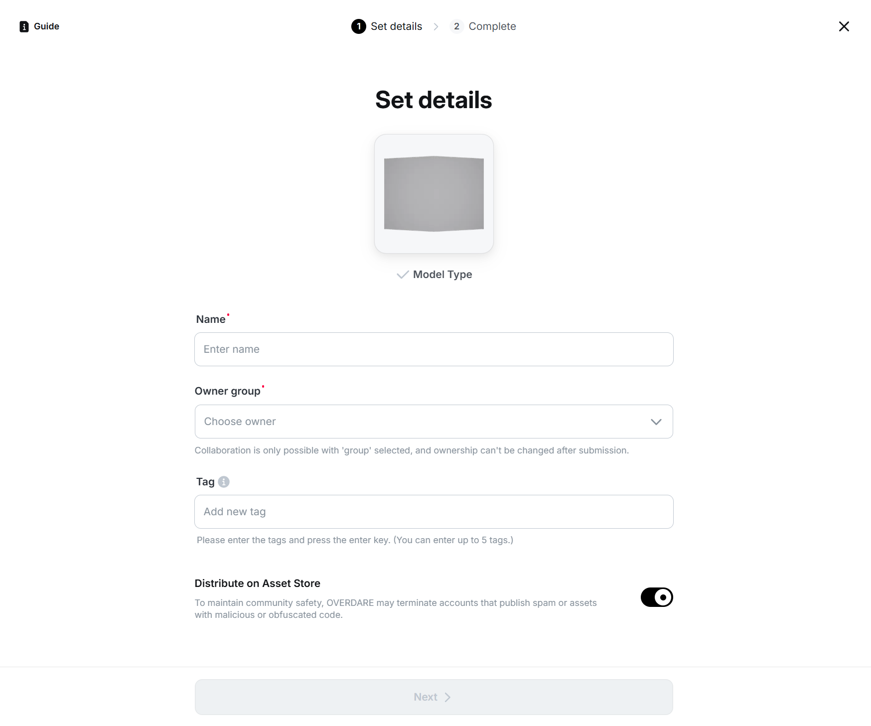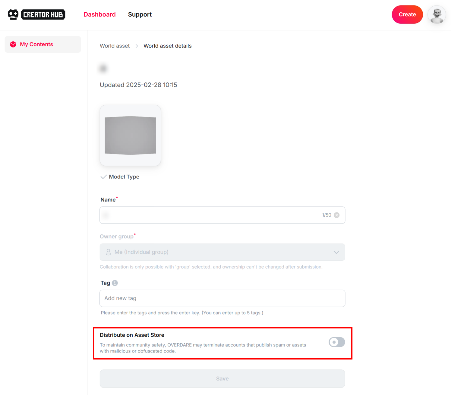 Save to OVERDARE를 클릭하면 에셋 정보를 입력하는 **웹 페이지로 자동 연결**됩니다. 웹 페이지를 찾은 다음, 에셋의 태그, 공개 여부 등 에셋 정보를 입력합니다.\
