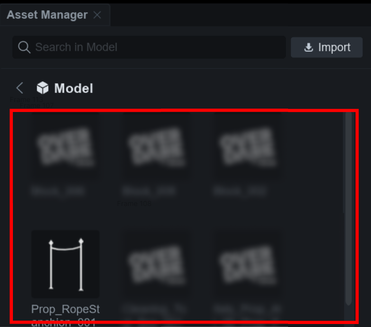등록이 완료된 에셋은 Studio내 **Asset Drawer**에서 확인할 수 있습니다. 공개 설정된 에셋은 다른 크리에이터도 사용할 수 있습니다.