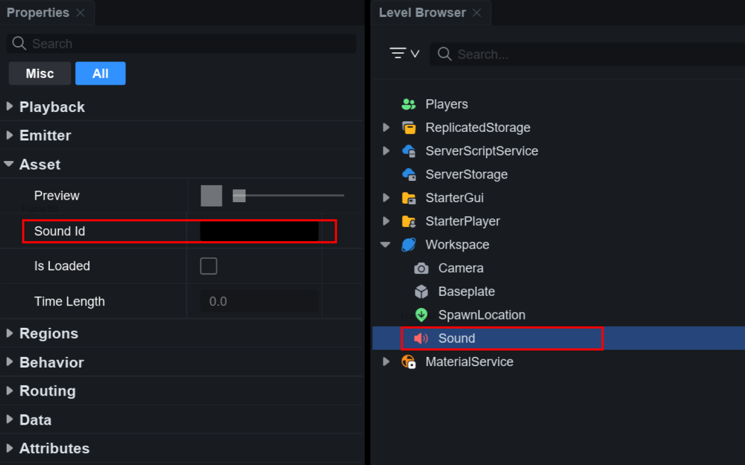 일부 오브젝트는 **에셋을 참조**하여 표시됩니다. 예를 들어, MeshPart 오브젝트는 표시할 메쉬를, MeshPart나 VFX는 텍스처를, 사운드는 재생할 오디오를 참조합니다. 이러한 경우, 해당 오브젝트에 **표시할 에셋의 Asset ID**를 연결해야 합니다.