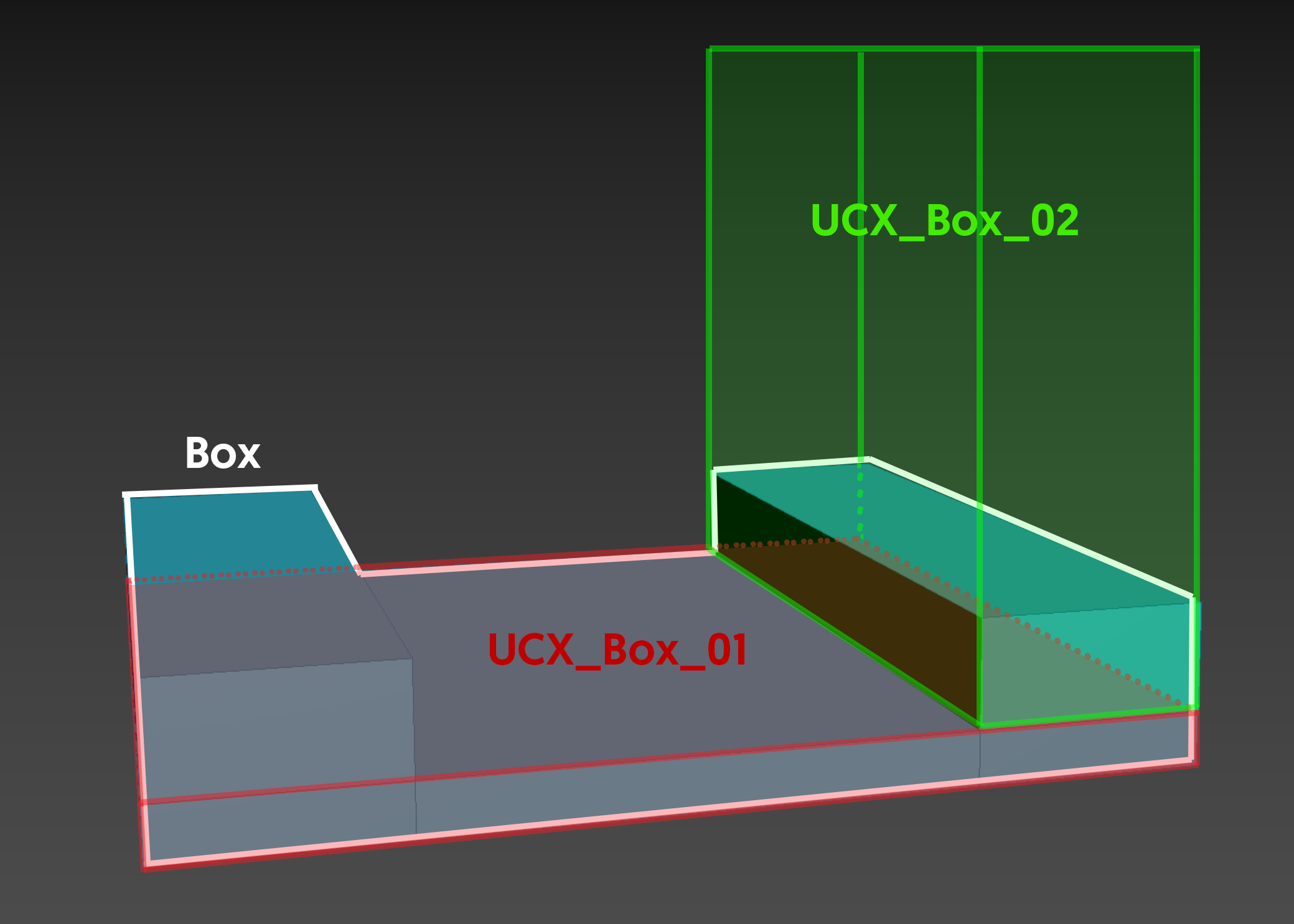 Blender나 3ds Max와 같은 3D 모델링 소프트웨어에서 **충돌용으로 사용할 메쉬**를 생성한 후, 해당 메쉬의 이름을 **UCX\_**&#xBA54;쉬이름 형식으로 지정하면 OVERDARE Studio에 임포트될 때, UCX\_ 접두어가 붙은 메쉬들은 **충돌체로 자동 인식**됩니다.