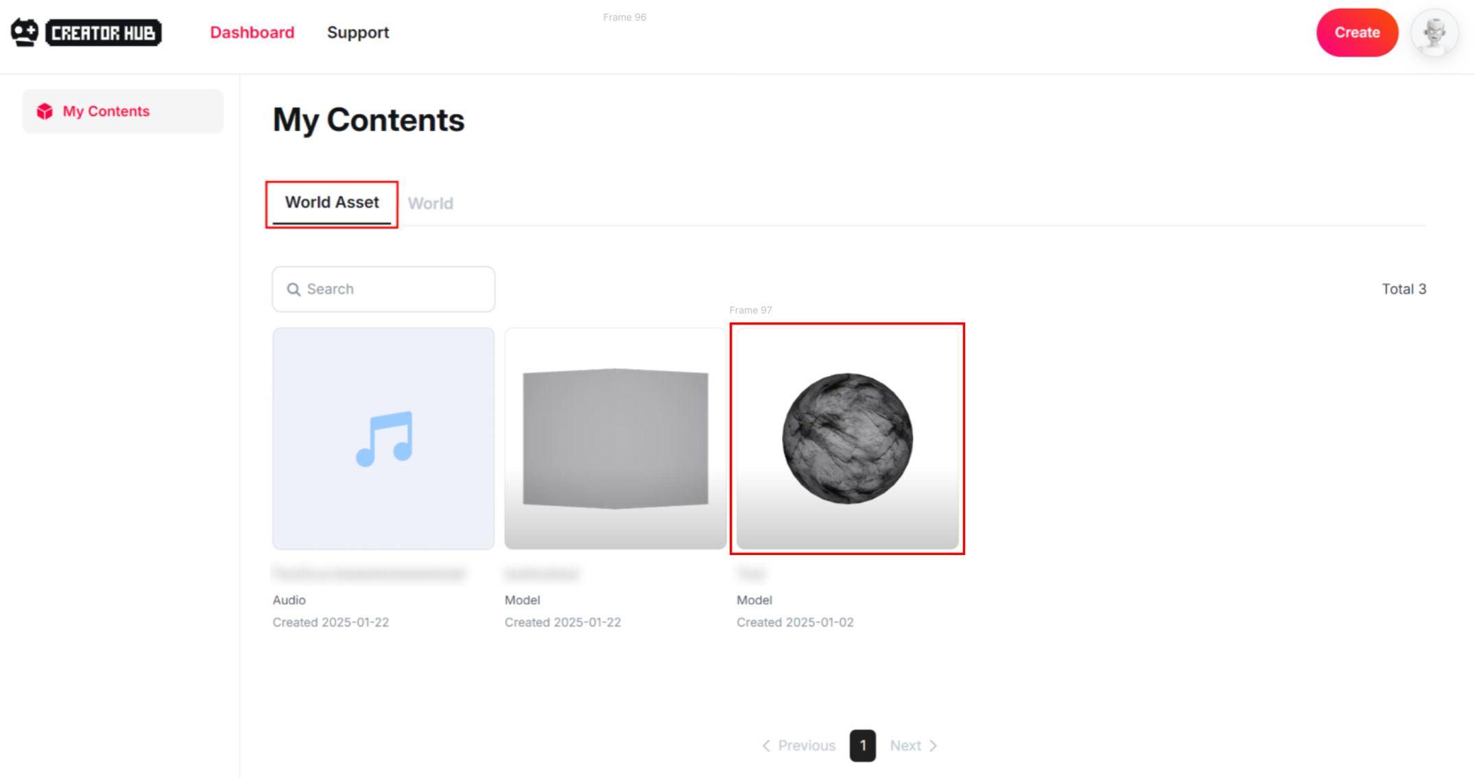 Dashboard에서 **World Asset 탭**을 눌러 등록한 모든 에셋을 확인할 수 있습니다.