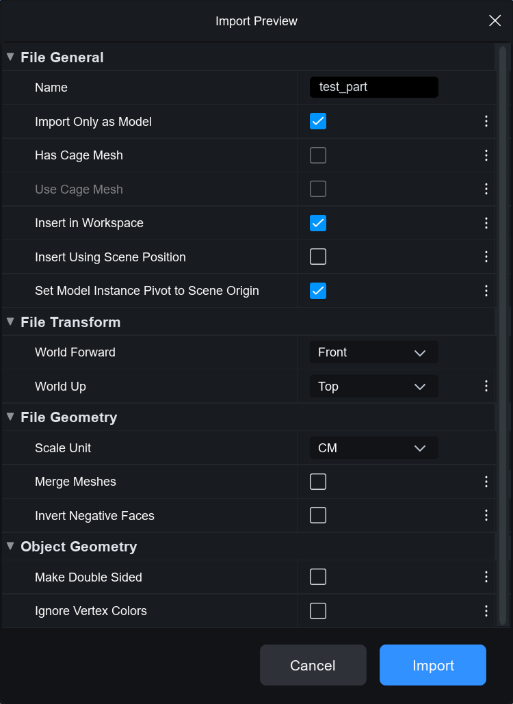 <table><thead><tr><th width="145">구분</th><th width="332">설명</th><th>기본값</th></tr></thead><tbody><tr><td>Name</td><td>사용자가 불러온 3D 에셋의 이름을 표시합니다. 에셋의 이름을 변경하여 프로젝트에서 노출되게 할 수 있습니다.</td><td><br></td></tr><tr><td>Import Only as Model</td><td>활성화된 경우, 모델에 여러 Child Objects가 포함되어 있더라도 모델을 단일 자산으로 불러옵니다.<br>체크박스를 해제하여 비활성화한 경우, 모델과 여러 메쉬 등 하위 항목들을 개별 에셋으로 불러옵니다.</td><td>기본적으로 활성화되어 있습니다.</td></tr><tr><td>Insert in Workspace</td><td>활성화된 경우, 사용자가 불러온 3D 에셋을 Workspace와 Asset Drawer에 삽입합니다.<br>체크박스를 해제하여 비활성화한 경우, Toolbox, Asset Manager에만 삽입됩니다.</td><td>기본적으로 활성화되어 있습니다.</td></tr><tr><td>Insert Using Scene Position</td><td>활성화된 경우, 모델을 Workspace에 삽입할 때의 current scene position을 사용합니다.</td><td>기본적으로 비활성화되어 있습니다.</td></tr><tr><td>Set Model Instance Pivot to Scene Origin</td><td>활성화된 경우, 전체 모델의 Pivot point를 Scene Origin으로 설정합니다.</td><td>기본적으로 활성화되어 있습니다.</td></tr></tbody></table>