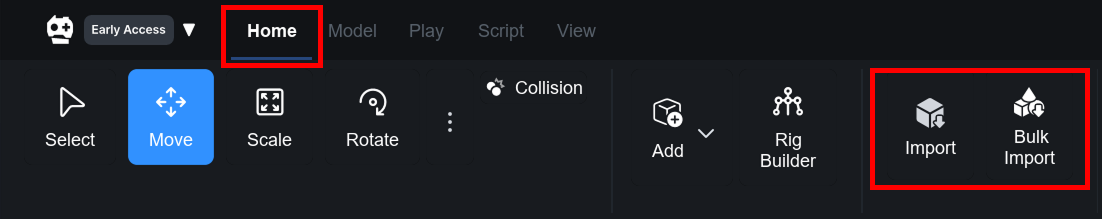 에셋 임포트는 OVERDARE Studio 최상단 탭 영역에서 **Home탭**을 선택하면 출력되는 **Import 버튼** 또는 **BulkImport 버튼**을 눌러 진행할 수 있습니다.