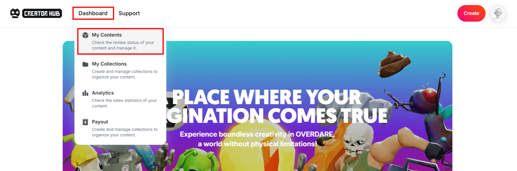 [Creator Hub](https://create.overdare.com/) 상단 메뉴 영역에서 Dashboard - My Contents를 눌러 Dashboard로 이동합니다.