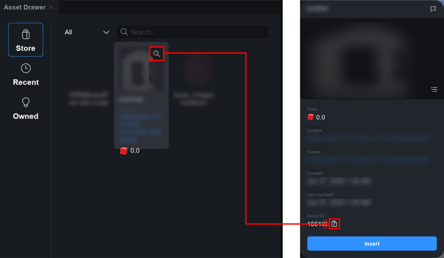 또는 **Asset Drawer**에서 에셋에 커서를 올리면 나오는 **돋모기 모양(🔍) 버튼**을 클릭하고, Asset Id 오른쪽에 있는 **복사 버튼**을 클릭해서 복사할 수 있습니다.