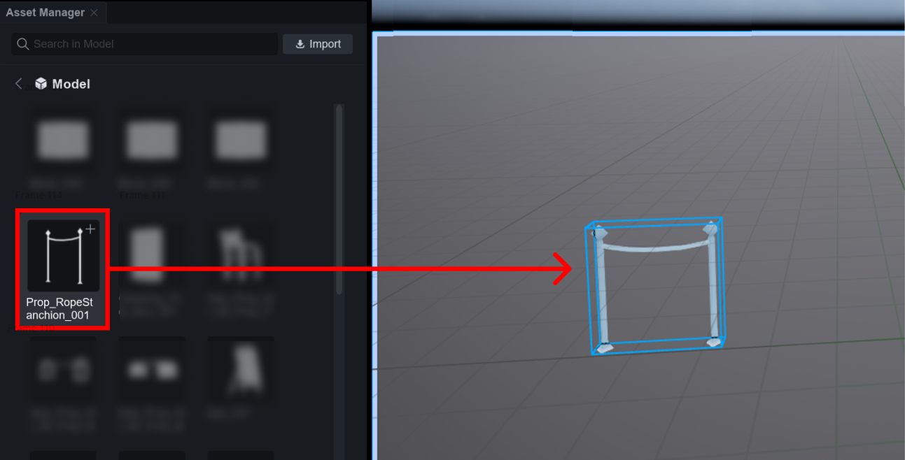 에셋을 더블클릭하거나, 드래그한 다음 Viewport로 드랍하면 Workspace에 에셋이 배치됩니다.