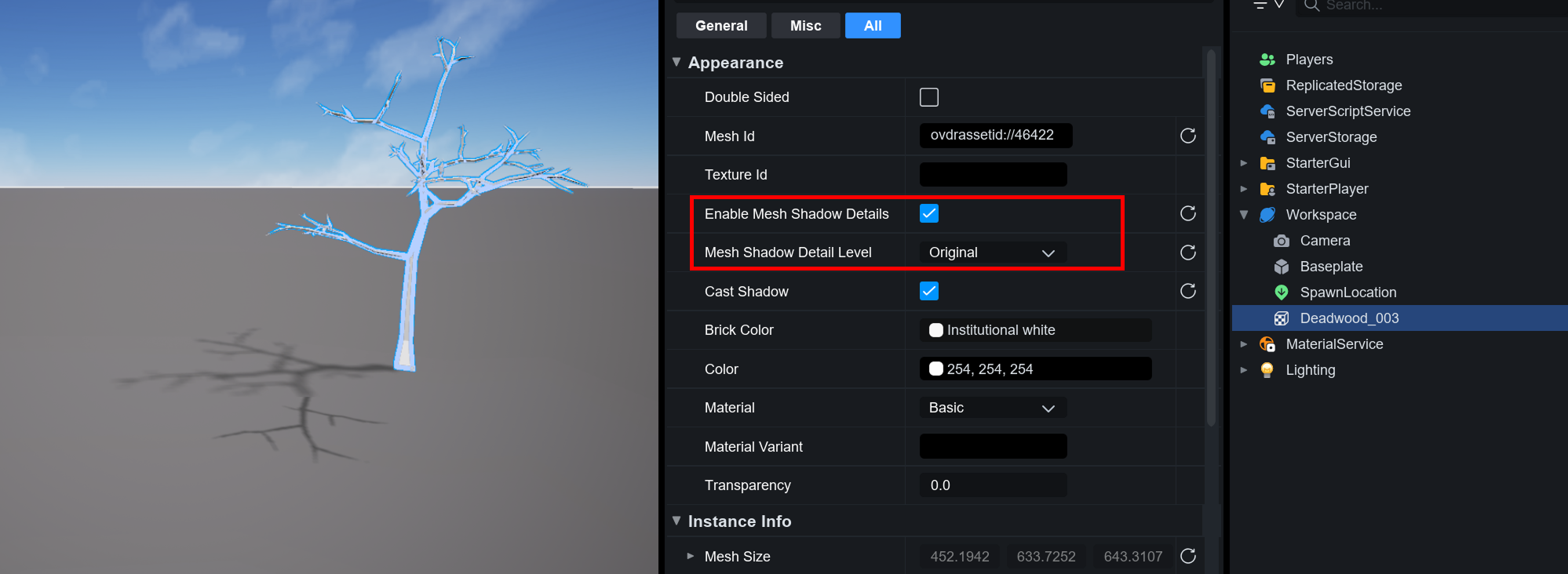 메쉬를 선택한 후 프로퍼티 패널에서 Enable Mesh Shadow Details를 활성화하면 개별 메시 단위로 Mesh Shadow Detail Level를 지정할 수 있으며, 이 경우 Lighting 서비스의 전역 설정이 아닌 해당 메쉬의 설정이 우선 적용됩니다.
