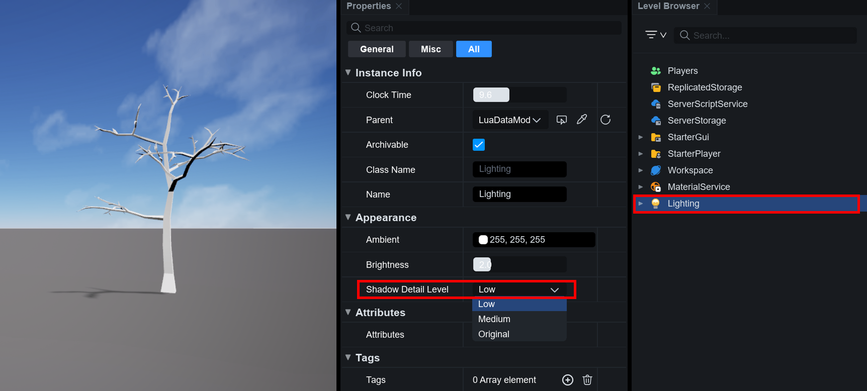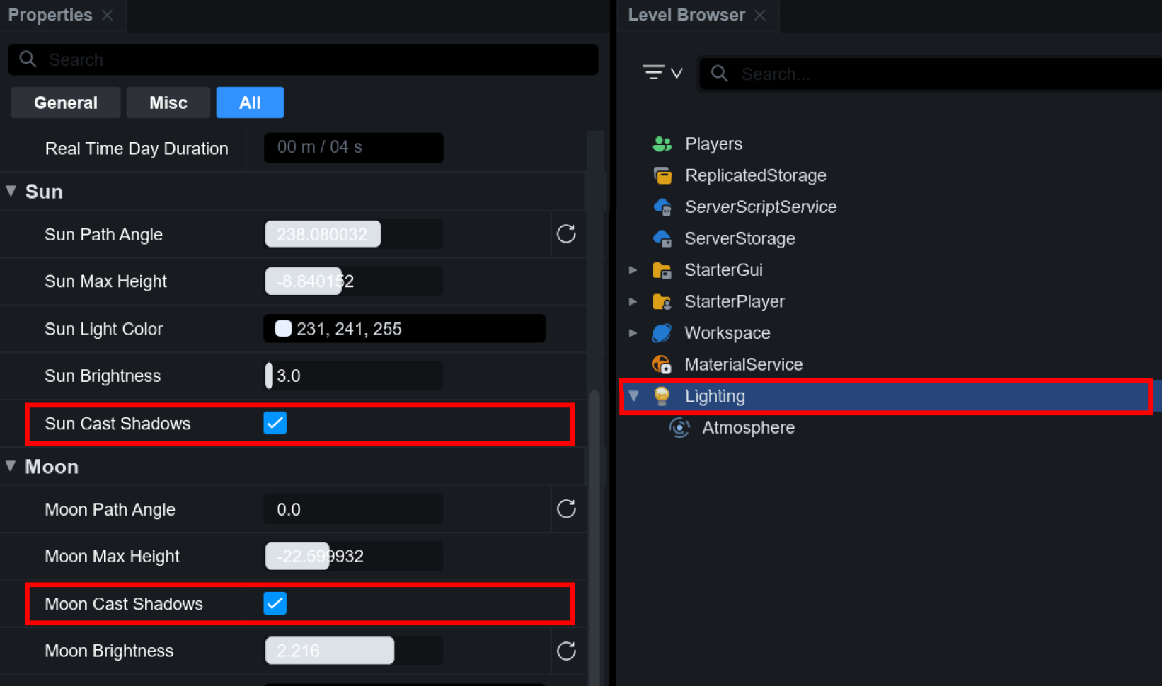 그림자를 활성화하려면 먼저 Lighting 서비스를 선택한 다음, 프로퍼티 패널에서 게임이 사용하는 낮/밤 시간대에 따라 Sun Cast Shadows 또는 Moon Cast Shadows 속성을 활성화해야 합니다.