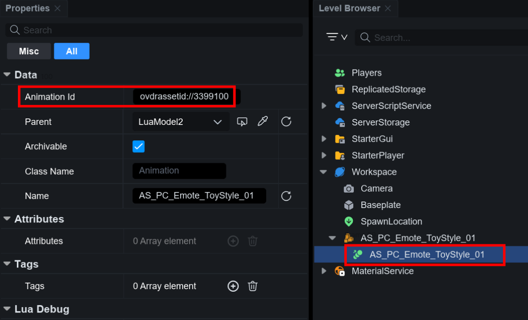 Asset Drawer에 Asset Name을 검색해서 애니메이션 패키지를 사용하세요. (Asset Id를 이용하면 Level Browser에 배치하지 않고 script에서 바로 사용할 수도 있습니다.)