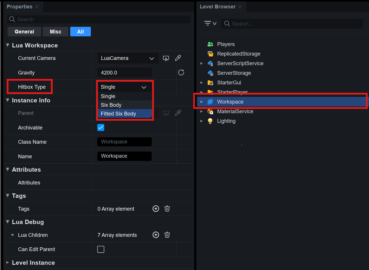 **Workspace**에서 히트박스를 설정하면, 모든 캐릭터의 피격 판정은 해당 히트박스 옵션을 따르게 됩니다.