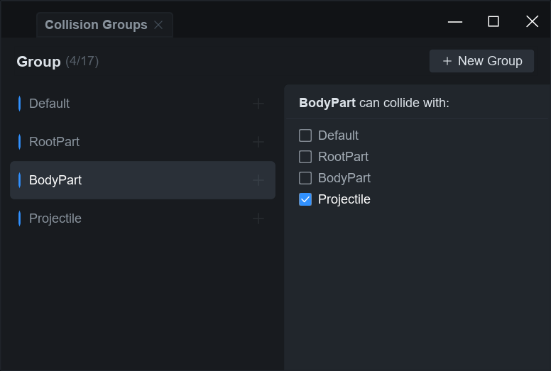 <table><thead><tr><th width="152.6666259765625">Collision Group</th><th width="361.4998779296875">설명</th><th width="231.83343505859375">비고</th></tr></thead><tbody><tr><td>Default</td><td>대부분의 일반 Part 및 MeshPart의 기본 그룹</td><td></td></tr><tr><td>RootPart</td><td>캐릭터의 HumanoidRootPart 전용 그룹</td><td>SixBody, FittedSixbody<br>사용 시 활성화</td></tr><tr><td>BodyPart</td><td>신체 부위(팔, 다리, 몸통)용 그룹</td><td>SixBody, FittedSixbody<br>사용 시 활성화</td></tr><tr><td>Projectile</td><td>BodyPart와 충돌하기 위한 발사체, 투사체 전용 그룹</td><td>SixBody, FittedSixbody<br>사용 시 활성화</td></tr></tbody></table>