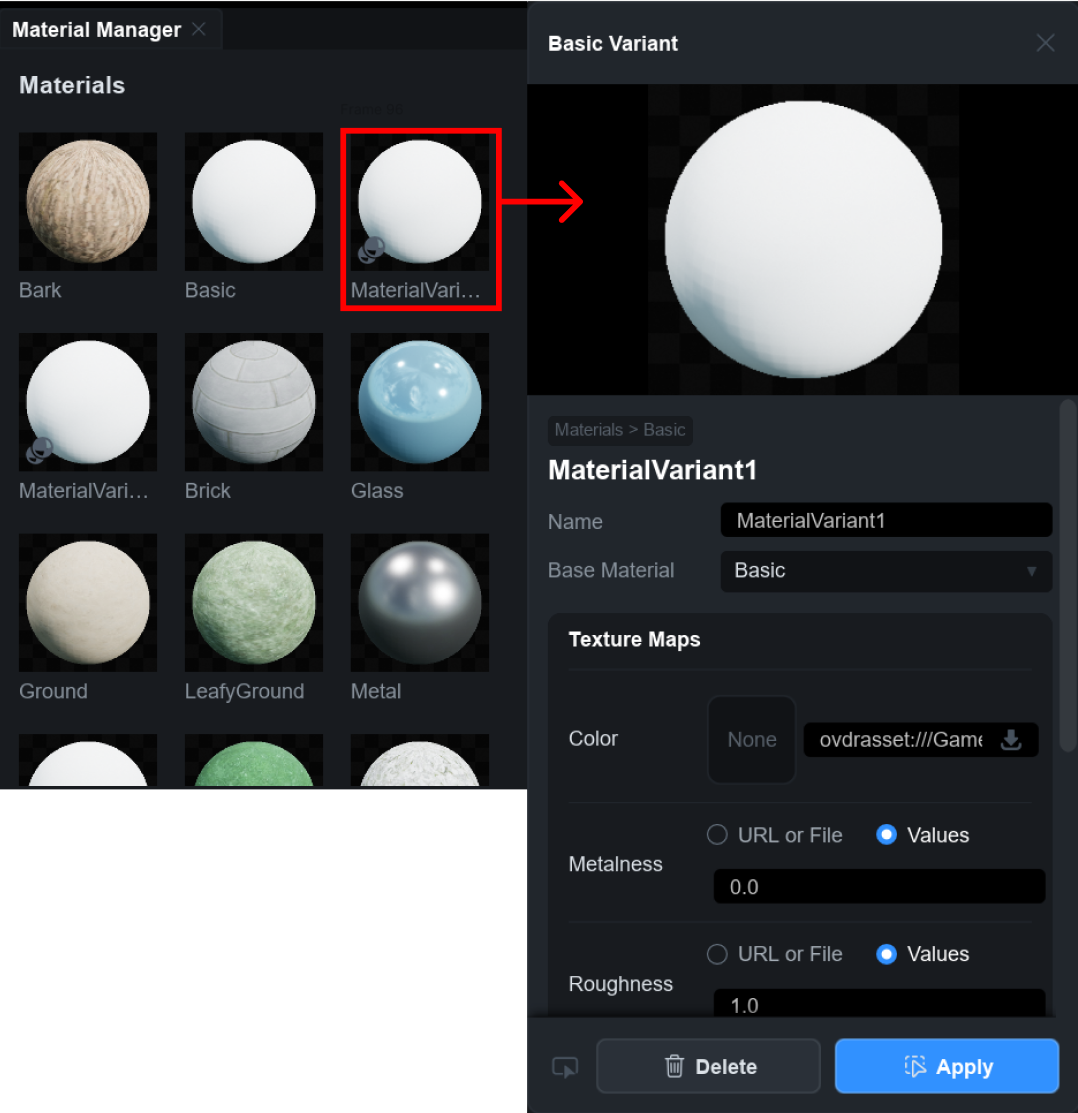 생성한 MaterialVariant를 클릭하면 표시되는 패널에서 프로퍼티를 수정하거나, MaterialVariant를 삭제할 수 있습니다.