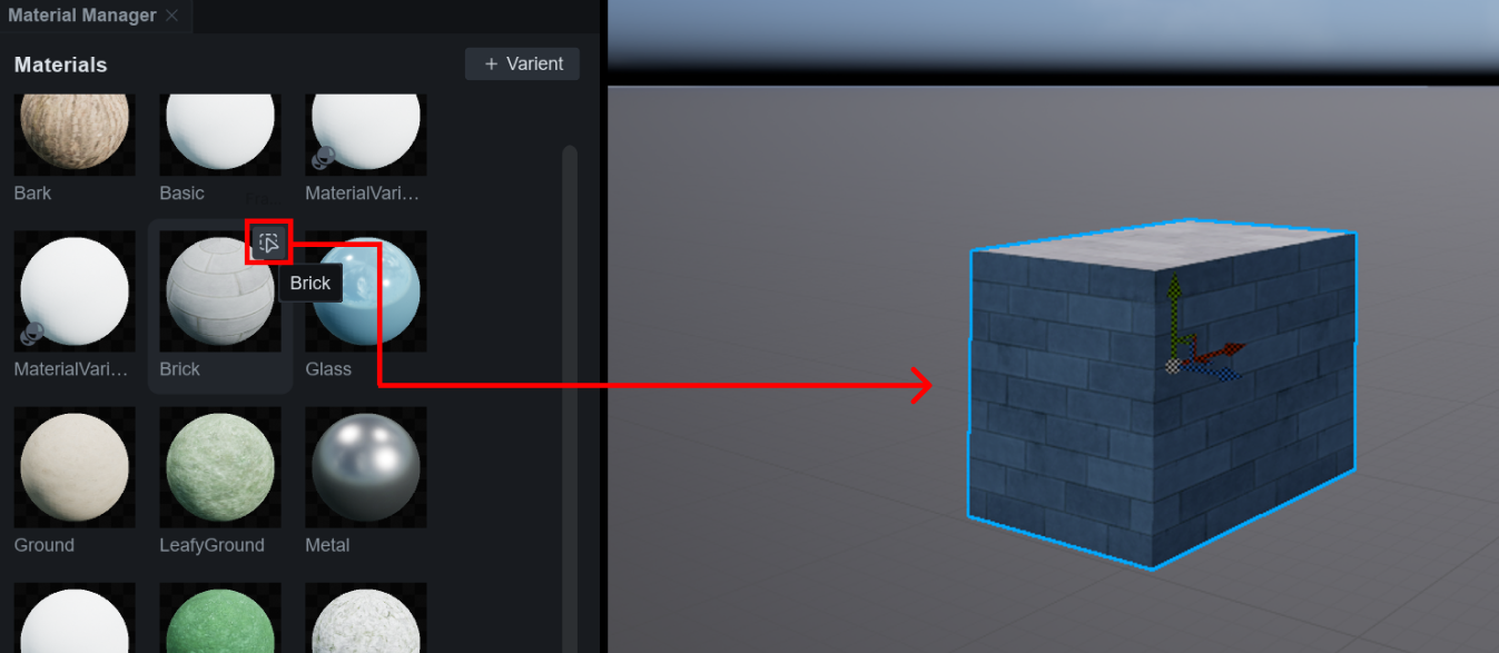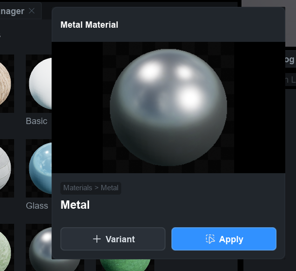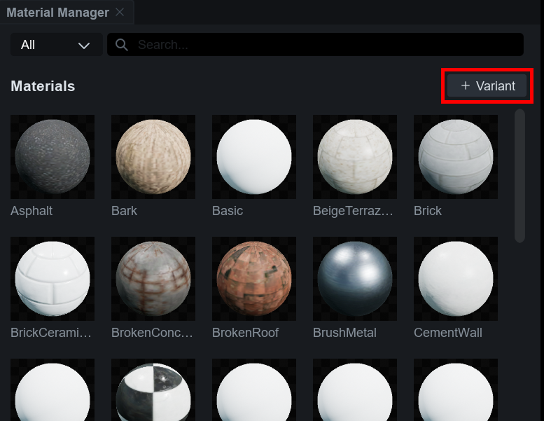 Material Manager 패널 우측 상단 **+ Variant 버튼**을 통해 MaterialVariant를 생성할 수 있습니다.