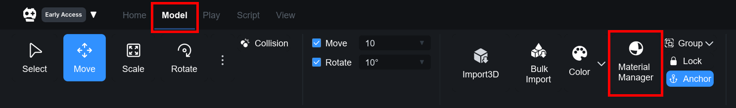 Material Manager는 OVERDARE Studio 최상단 탭 영역에서 **Model탭**을 선택하면 출력되는 **Material Manager 버튼**을 클릭해서 표시할 수 있습니다.