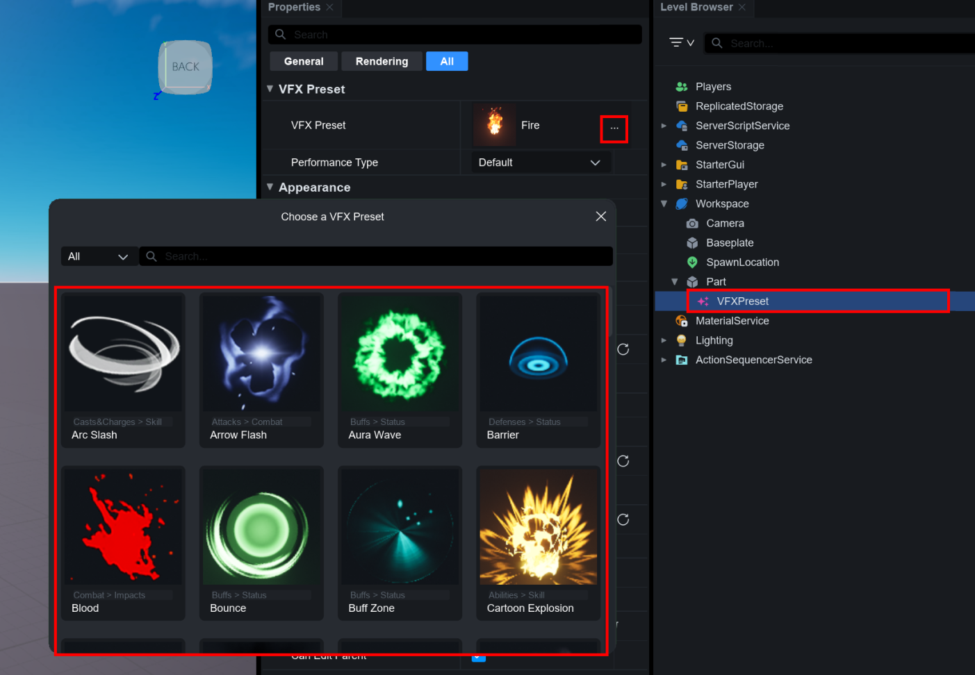 Level Browser에 VFXPreset을 배치하고 선택한 다음, 프로퍼티 패널에서 VFX Preset 속성을 찾아 표시한 버튼을 클릭하면 VFX Preset 선택 팝업이 표시됩니다.