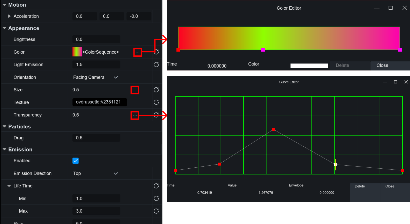 <table><thead><tr><th width="251">프로퍼티</th><th>설명</th></tr></thead><tbody><tr><td>Acceleration</td><td>가속도의 방향과 크기</td></tr><tr><td>Brightness</td><td>밝기</td></tr><tr><td>Color</td><td>입자의 색상</td></tr><tr><td>Light Emission</td><td>빛을 발산하는 정도</td></tr><tr><td>Orientation</td><td><p>회전 방향</p><ul><li>Facing Camera : 파티클이 항상 카메라(플레이어가 보는 방향)를 향하도록 정렬</li><li>Facing Camera World Up : 파티클이 카메라를 향하지만, 파티클의 "위쪽"은 항상 월드 좌표의 위쪽(Y축)을 유지</li><li>Velocity Parallel : 파티클이 이동하는 속도 벡터와 평행하게 정렬</li><li>Velocity Perpendicular : 파티클이 이동하는 속도 벡터에 수직으로 정렬</li></ul></td></tr><tr><td>Size</td><td>크기</td></tr><tr><td>Texture</td><td>파티클에 사용할 텍스처 Id (ovdrassetid://번호 형식)</td></tr><tr><td>Transparency</td><td>투명도</td></tr><tr><td>Drag</td><td>공기 저항</td></tr><tr><td>Enabled</td><td>활성화 여부</td></tr><tr><td>Emission Direction</td><td><p>생성되는 방향</p><ul><li>Top : 파티클이 위쪽으로 방출</li><li>Right : 파티클이 오른쪽으로 방출</li><li>Back : 파티클이 뒤쪽으로 방출</li><li>Left : 파티클이 왼쪽으로 방출</li><li>Bottom : 파티클이 아래쪽으로 방출</li><li>Front : 파티클이 앞쪽으로 방출</li></ul></td></tr><tr><td>Life Time</td><td>개별 입자가 생성된 후 사라지기까지의 시간</td></tr><tr><td>Rate</td><td>초당 생성되는 개수</td></tr><tr><td>Rot Speed</td><td>회전 속도</td></tr><tr><td>Rotation</td><td>초기 회전 각도</td></tr><tr><td>Speed</td><td>초기 속도</td></tr><tr><td>Spread Angle</td><td>파티클이 생성될 때의 각도 범위</td></tr><tr><td>Squash</td><td>파티클의 압축 효과</td></tr><tr><td>Flipbook Layout</td><td><p>텍스처 시트의 행과 열</p><ul><li>None : Flipbook 애니메이션 미사용</li><li>Grid 2x2 : 텍스처를 2x2 그리드로 분할</li><li>Grid 4x4 : 텍스처를 4x4 그리드로 분할</li><li>Grid 8x8 : 텍스처를 8x8 그리드로 분할</li></ul></td></tr><tr><td>Flipbook Framerate</td><td>애니메이션 텍스처의 프레임 속도</td></tr><tr><td>Flipbook Mode</td><td><p>텍스처 애니메이션의 모드</p><ul><li>Loop : 애니메이션이 처음부터 끝까지 반복적으로 재생</li><li>One Shot : 애니메이션이 한 번만 재생</li><li>Ping Pong : 애니메이션이 처음부터 끝까지 재생된 후, 반대로 끝에서 처음으로 재생</li><li>Random : 텍스처의 애니메이션 프레임을 무작위 순서로 재생합</li></ul></td></tr><tr><td>Flipbook Start Random</td><td>애니메이션이 임의의 프레임에서 시작되도록 설정</td></tr><tr><td>Shape</td><td><p>파티클이 생성되는 기본 모양</p><ul><li>Box : 파티클이 박스 형태의 영역에서 생성</li><li>Sphere : 파티클이 구체 형태의 영역에서 생성</li><li>Cylinder : 파티클이 원기둥 형태의 영역에서 생성</li><li>Disc : 파티클이 평평한 원반 형태의 영역에서 생성</li></ul></td></tr><tr><td>Shape in Out</td><td><p>파티클이 생성 및 소멸되는 과정에서의 이동 패턴을 설정</p><ul><li>Outward : 파티클이 설정된 Shape 영역 바깥 방향으로 방출</li><li>One : 파티클이 설정된 Shape 영역의 안쪽으로 향해 방출</li></ul></td></tr><tr><td>Shape Style</td><td><p>파티클 생성 시 모양 스타일을 설정</p><ul><li>Volume : Shape의 전체 부피에서 랜덤한 위치에서 생성</li><li>Surface : Shape의 표면에서만 생성</li></ul></td></tr><tr><td>LockedToPart</td><td>파티클이 부착된 객체가 움직일 때, 입자들이 함께 이동할지 여부</td></tr></tbody></table>