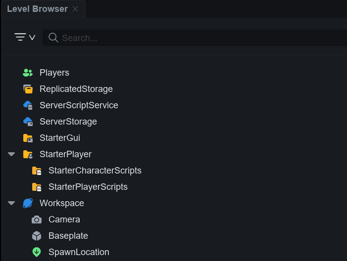 Scripts can be created in various locations such as Workspace or ReplicatedStorage from the **Level Browser**. Depending on the type of script and its placement, its purpose and execution availability can vary.