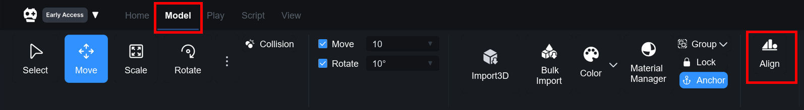 The Align Tool can be displayed by clicking the **Align button** which appears when you select the **Model tab** in the top tab area of OVERDARE Studio.