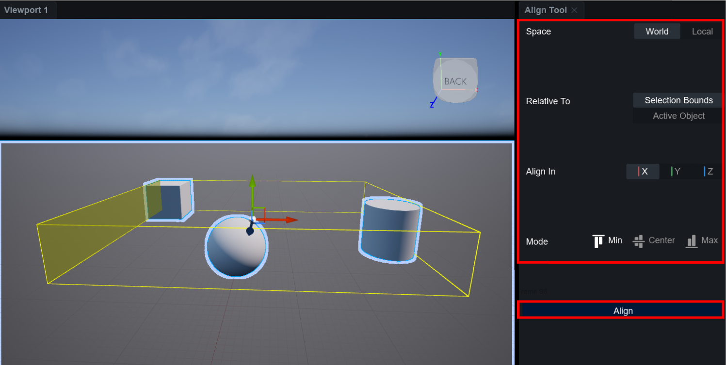 <table><thead><tr><th width="211">Category</th><th>Description</th></tr></thead><tbody><tr><td>Selection Bounds</td><td>The alignment is based on the Bounding Box that encompasses all selected objects.</td></tr><tr><td>Active Object</td><td>The alignment is based on the active object among the selected objects.</td></tr></tbody></table>