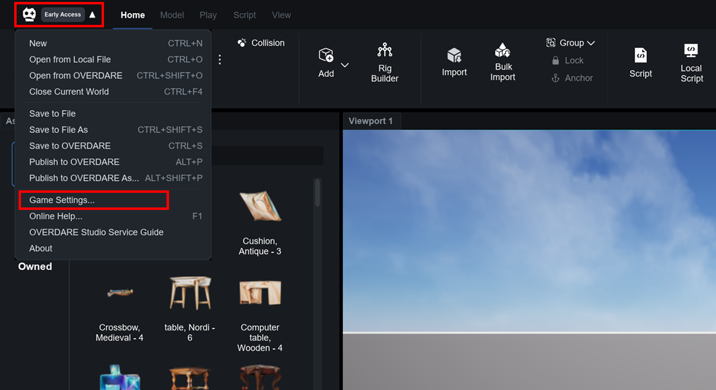 Open a world created in OVERDARE Studio, click the button in the top-right corner, then select **Game Settings** from the menu that appears.