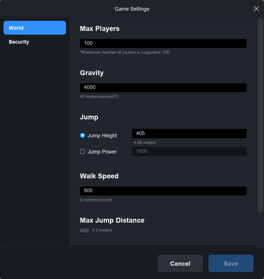 <table><thead><tr><th width="206">Option</th><th width="342">Description</th><th>Notes</th></tr></thead><tbody><tr><td>Max Player</td><td>Sets the maximum number of players that can join the game.</td><td></td></tr><tr><td>Gravity</td><td>Defines the world's gravity in meters per second squared.</td><td>n meter/second^2</td></tr><tr><td>Jump Height</td><td>Determines the character's jump height.</td><td><p>n meter</p><p>(Min: 0, Max: Unlimited)</p></td></tr><tr><td>Jump Power</td><td>Controls the force of a character's jump.</td><td></td></tr><tr><td>Walk Speed</td><td>Sets the character's walking speed in meters per second.</td><td>n meters/second</td></tr><tr><td>Max Jump Distance</td><td>Calculated based on the configured Gravity and Jump settings.</td><td>n meters</td></tr><tr><td>Max Slope Angle</td><td>Sets the maximum slope angle the character can walk on.</td><td></td></tr></tbody></table>