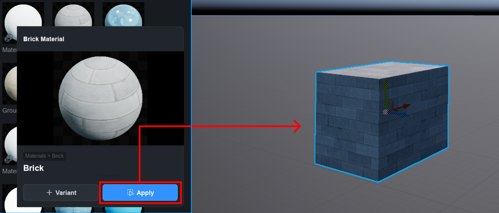 Alternatively, select the Part you want to apply the Material or MaterialVariant to, click the Material or MaterialVariant, and then click the **Apply button** in the displayed panel.