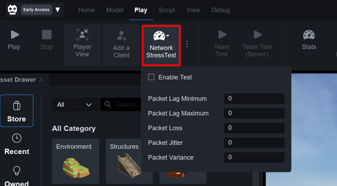 In the **Play tab**, click the arrow (🔽) next to the Stop button to configure test options.