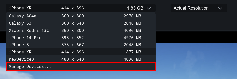 Click **Manage Devices** in the device selection dropdown menu to open the Emulation Device Manager window, where a new device can be added.