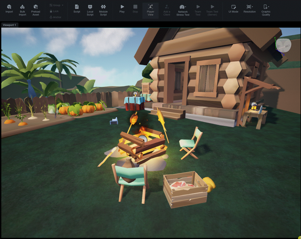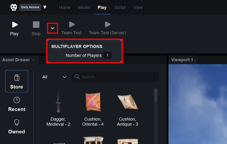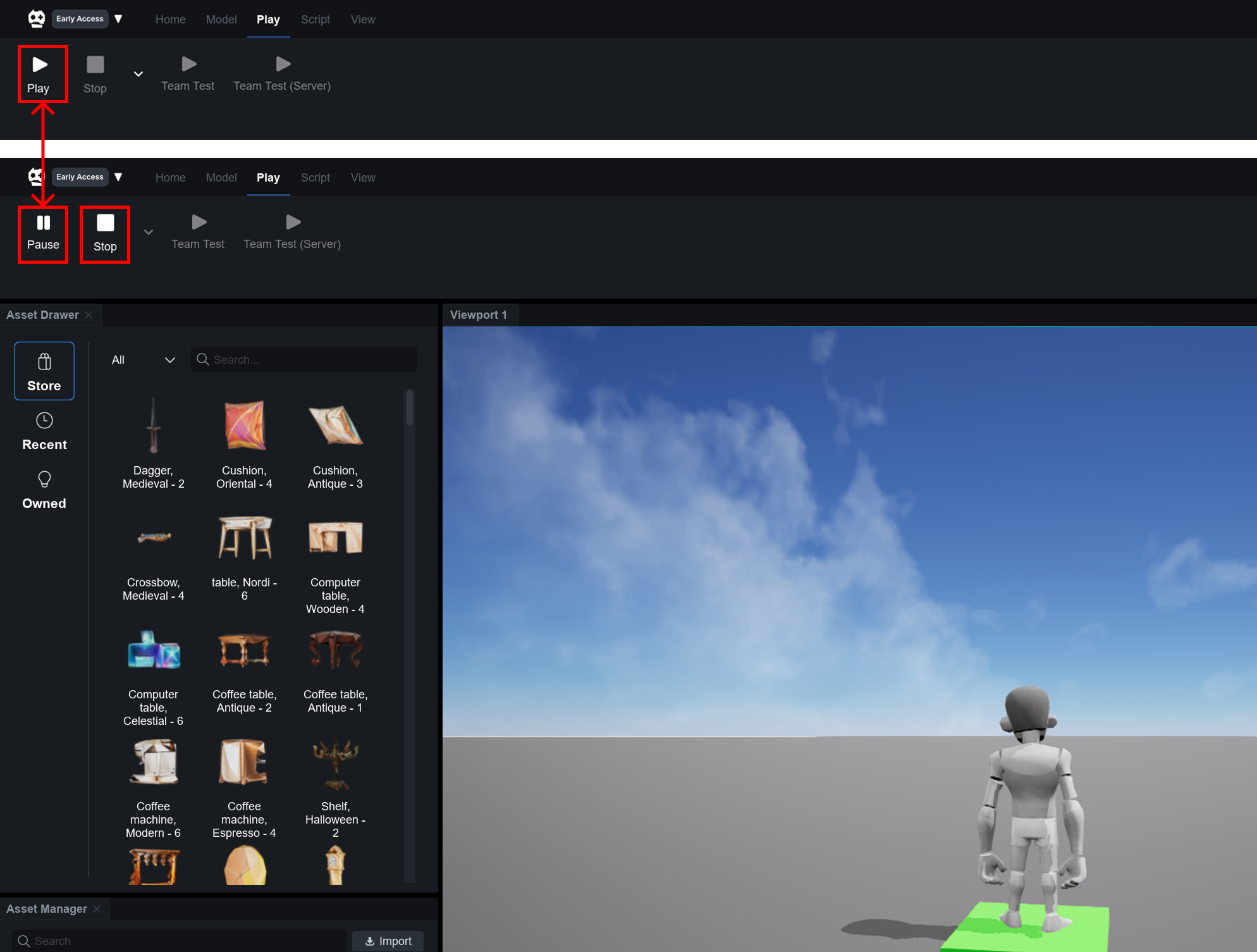 In OVERDARE Studio, you can test and verify the functionality of placed objects or scripts using the **Play** feature. This allows you to check your work in real-time and quickly identify any necessary adjustments.