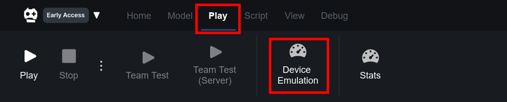 The Device Emulation function can be enabled or disabled by clicking **Device Emulation** in the **Play tab** on the top tab area of ​​OVERDARE Studio.