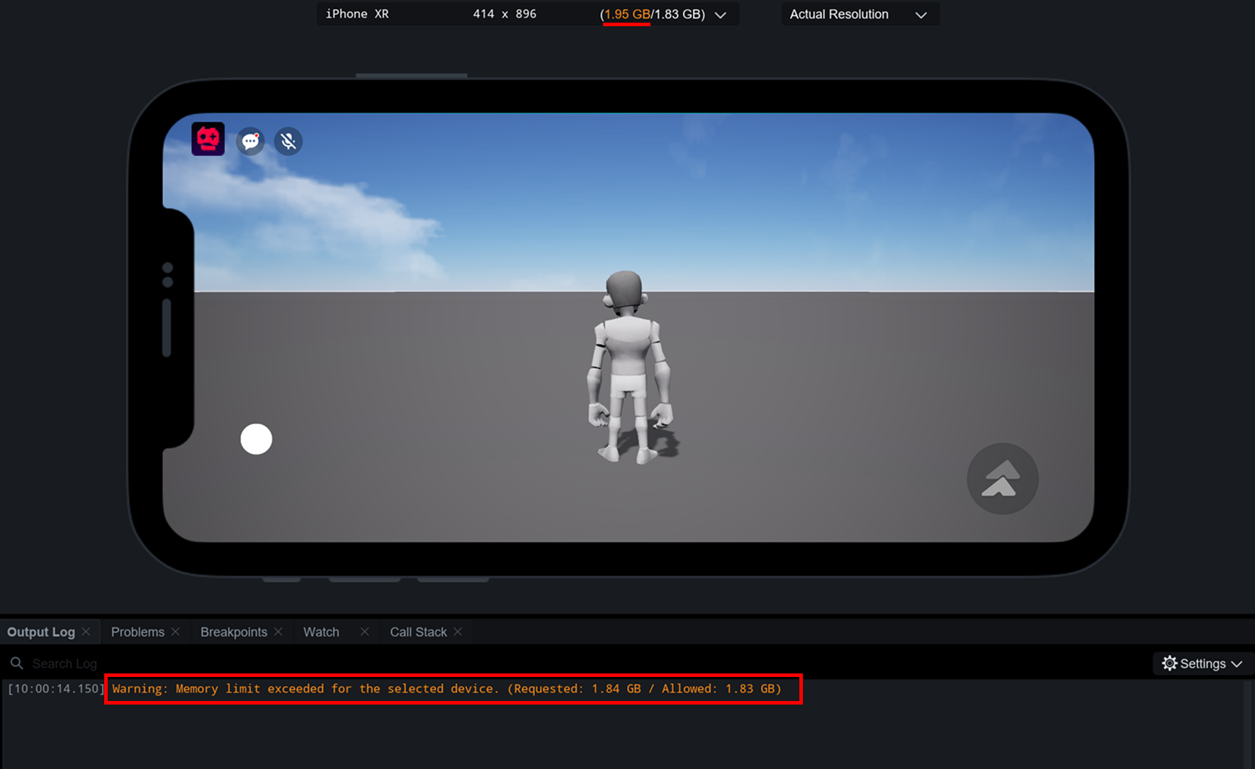 If the selected device's memory limit exceeds, the memory usage at the top of the viewport is displayed in orange, and a warning is output to the Output Log.