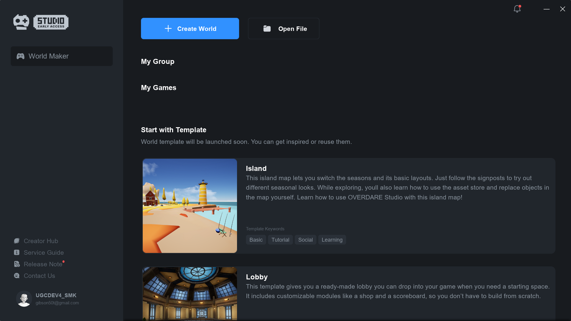 World templates are displayed in the **Start with Template** section on the first screen of OVERDARE Studio. By clicking on the desired template, you can duplicate it and create a new project.